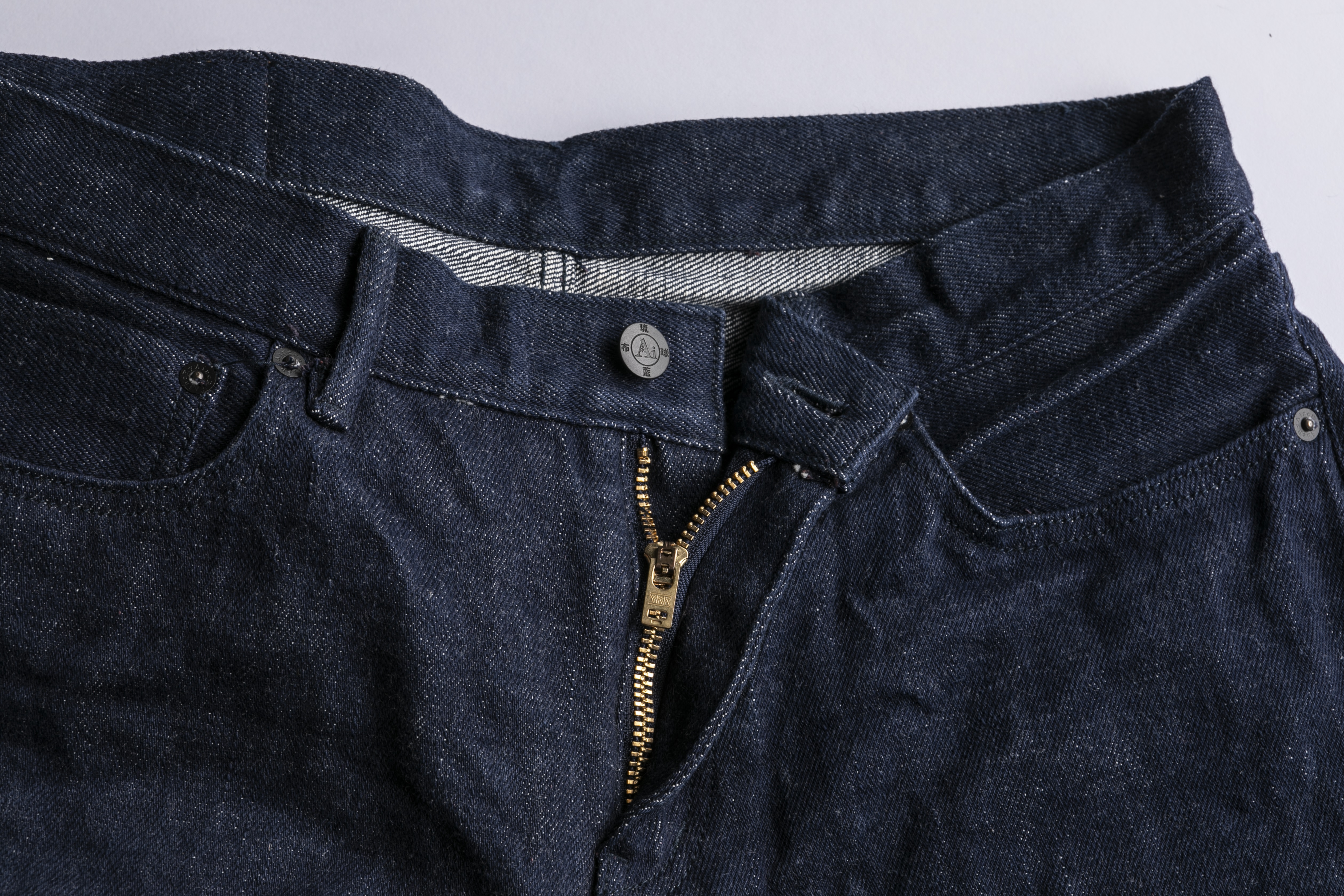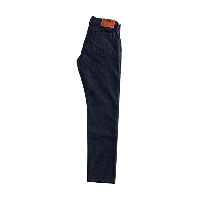 琉球藍染100%で染め抜いたアコークローデニムを、ブラックステッチで仕上げたジップフライテーパードジーンズ。